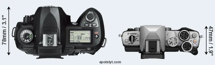 The side-by-side display below illustrates the physical size and weight of the Nikon D70s and the Olympus E-M10 II. The two cameras are presented according to their relative size. Three consecutive perspectives from the front, the top, and the back are available. All size dimensions are rounded to the nearest millimeter.