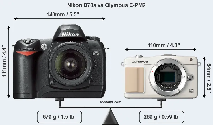 If the front view area (width x height) of the cameras is taken as an aggregate measure of their size, the Olympus E-PM2 is considerably smaller (55 percent) than the Nikon D70s. Moreover, the E-PM2 is substantially lighter (60 percent) than the D70s. In this context, it is worth noting that neither the D70s nor the E-PM2 are weather-sealed.