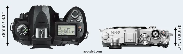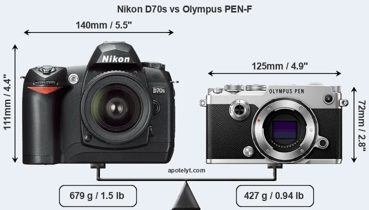 The side-by-side display below illustrates the physical size and weight of the Nikon D70s and the Olympus PEN-F. The two cameras are presented according to their relative size. Three consecutive perspectives from the front, the top, and the back are available. All width, height and depth measures are rounded to the nearest millimeter.