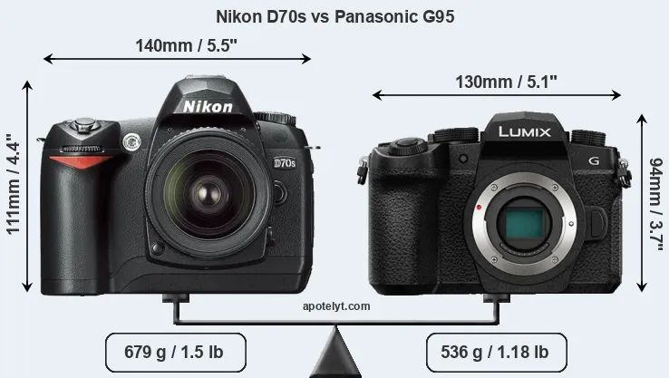 If the front view area (width x height) of the cameras is taken as an aggregate measure of their size, the Panasonic G95 is notably smaller (21 percent) than the Nikon D70s. Moreover, the G95 is markedly lighter (21 percent) than the D70s. It is noteworthy in this context that the G95 is splash and dust-proof, while the D70s does not feature any corresponding weather-sealing.