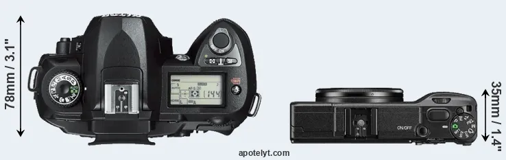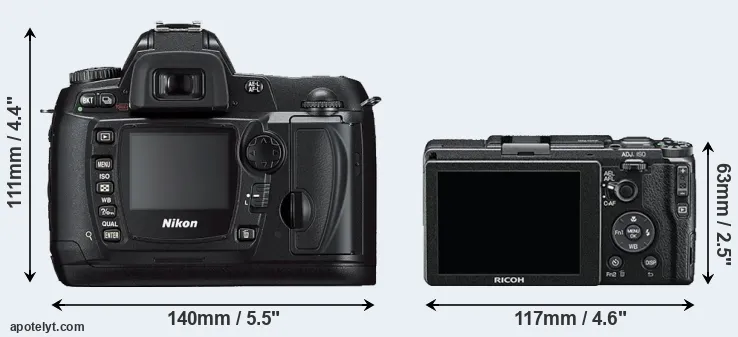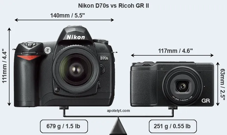 An illustration of the physical size and weight of the Nikon D70s and the Ricoh GR II is provided in the side-by-side display below. The two cameras are presented according to their relative size. Three consecutive views from the front, the top, and the rear side are shown. All width, height and depth measures are rounded to the nearest millimeter.