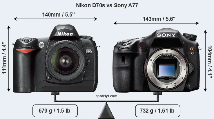 The side-by-side display below illustrates the physical size and weight of the Nikon D70s and the Sony A77. The two cameras are presented according to their relative size. Three consecutive views from the front, the top, and the rear side are shown. All width, height and depth measures are rounded to the nearest millimeter.