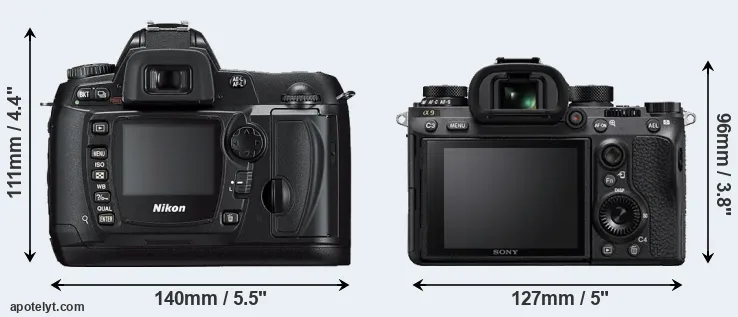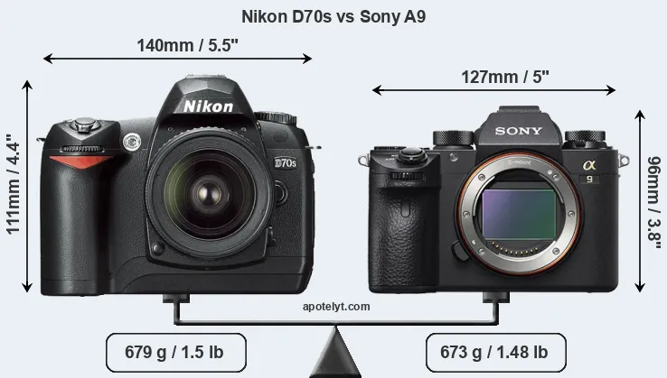 The physical size and weight of the Nikon D70s and the Sony A9 are illustrated in the side-by-side display below. The two cameras are presented according to their relative size. Three consecutive perspectives from the front, the top, and the back are available. All width, height and depth dimensions are rounded to the nearest millimeter.