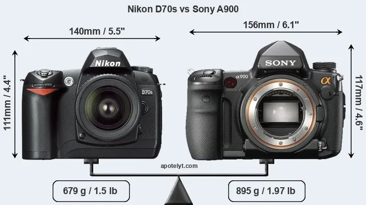 The side-by-side display below illustrates the physical size and weight of the Nikon D70s and the Sony A900. The two cameras are presented according to their relative size. Three consecutive perspectives from the front, the top, and the back are available. All size dimensions are rounded to the nearest millimeter.
