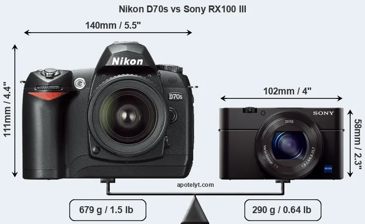 The physical size and weight of the Nikon D70s and the Sony RX100 III are illustrated in the side-by-side display below. The two cameras are presented according to their relative size. Three consecutive views from the front, the top, and the rear side are shown. All width, height and depth measures are rounded to the nearest millimeter.
