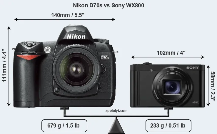 The physical size and weight of the Nikon D70s and the Sony WX800 are illustrated in the side-by-side display below. The two cameras are presented according to their relative size. Three successive views from the front, the top, and the rear are shown. All width, height and depth measures are rounded to the nearest millimeter.