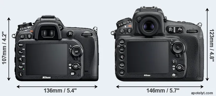 The physical size and weight of the Nikon D7100 and the Nikon D810 are illustrated in the side-by-side display below. The two cameras are presented according to their relative size. Three successive views from the front, the top, and the rear are shown. All size dimensions are rounded to the nearest millimeter.