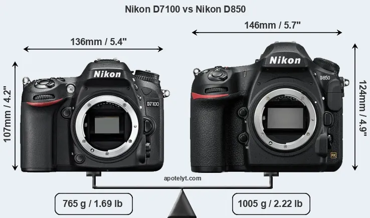 The side-by-side display below illustrates the physical size and weight of the Nikon D7100 and the Nikon D850. The two cameras are presented according to their relative size. Three successive views from the front, the top, and the rear are shown. All width, height and depth measures are rounded to the nearest millimeter.
