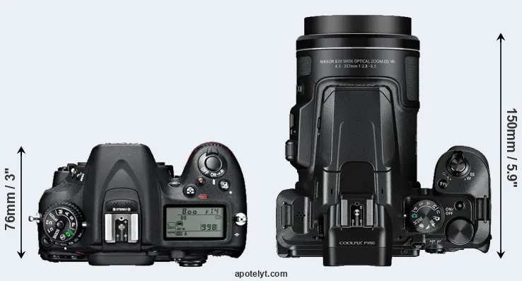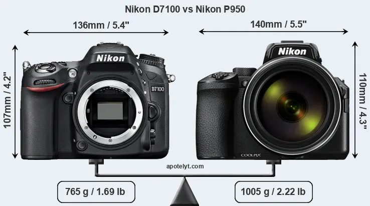 The physical size and weight of the Nikon D7100 and the Nikon P950 are illustrated in the side-by-side display below. The two cameras are presented according to their relative size. Three consecutive views from the front, the top, and the rear side are shown. All size dimensions are rounded to the nearest millimeter.