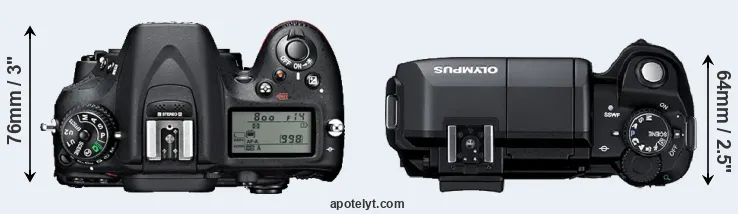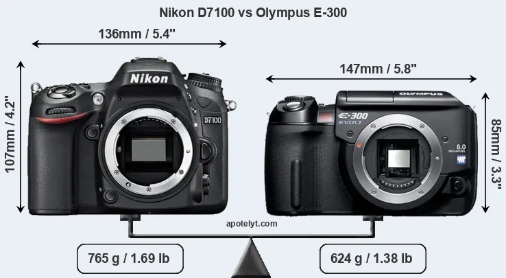 The side-by-side display below illustrates the physical size and weight of the Nikon D7100 and the Olympus E-300. The two cameras are presented according to their relative size. Three successive views from the front, the top, and the rear are shown. All width, height and depth measures are rounded to the nearest millimeter.