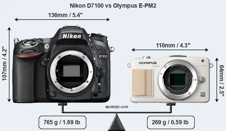 The physical size and weight of the Nikon D7100 and the Olympus E-PM2 are illustrated in the side-by-side display below. The two cameras are presented according to their relative size. Three successive views from the front, the top, and the rear are shown. All width, height and depth dimensions are rounded to the nearest millimeter.