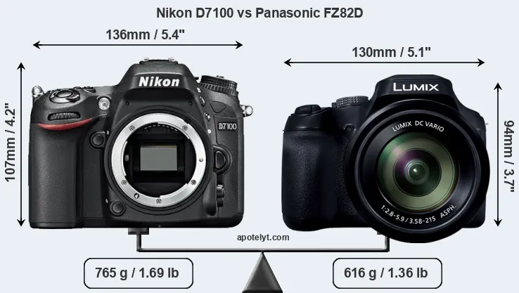 An illustration of the physical size and weight of the Nikon D7100 and the Panasonic FZ82D is provided in the side-by-side display below. The two cameras are presented according to their relative size. Three consecutive views from the front, the top, and the rear side are shown. All width, height and depth measures are rounded to the nearest millimeter.