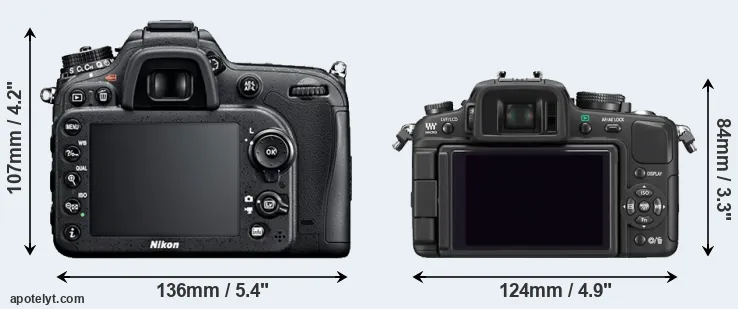An illustration of the physical size and weight of the Nikon D7100 and the Panasonic G1 is provided in the side-by-side display below. The two cameras are presented according to their relative size. Three successive views from the front, the top, and the rear are shown. All width, height and depth dimensions are rounded to the nearest millimeter.