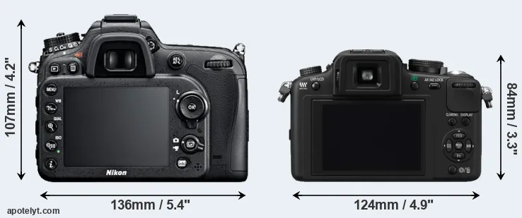 An illustration of the physical size and weight of the Nikon D7100 and the Panasonic G10 is provided in the side-by-side display below. The two cameras are presented according to their relative size. Three successive views from the front, the top, and the rear are shown. All width, height and depth dimensions are rounded to the nearest millimeter.