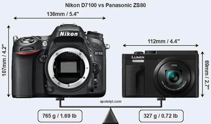 The physical size and weight of the Nikon D7100 and the Panasonic ZS80 are illustrated in the side-by-side display below. The two cameras are presented according to their relative size. Three consecutive views from the front, the top, and the rear side are shown. All width, height and depth dimensions are rounded to the nearest millimeter.
