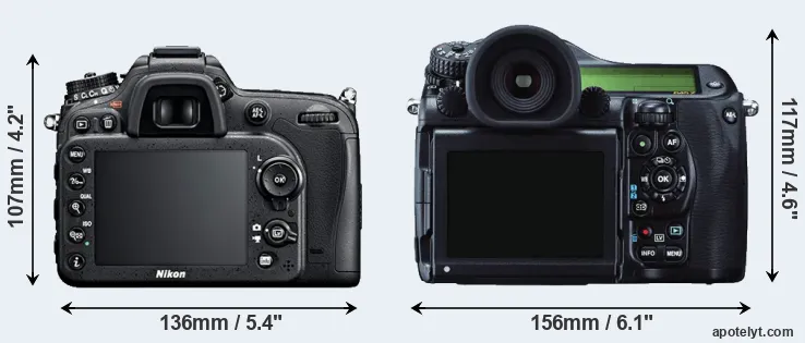 The side-by-side display below illustrates the physical size and weight of the Nikon D7100 and the Pentax 645Z. The two cameras are presented according to their relative size. Three successive views from the front, the top, and the rear are shown. All width, height and depth dimensions are rounded to the nearest millimeter.