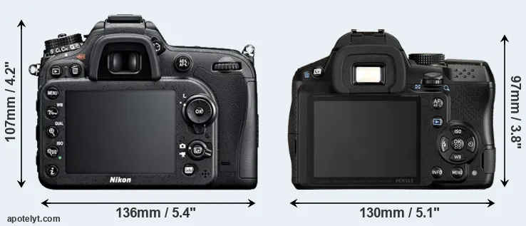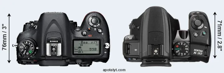 The side-by-side display below illustrates the physical size and weight of the Nikon D7100 and the Pentax K-30. The two cameras are presented according to their relative size. Three consecutive views from the front, the top, and the rear side are shown. All size dimensions are rounded to the nearest millimeter.
