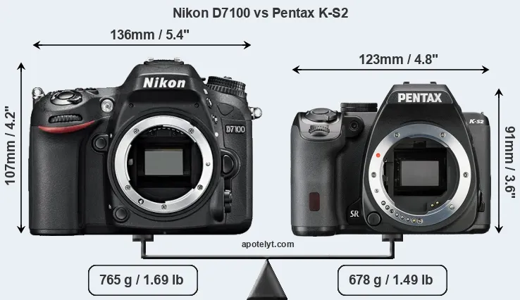 An illustration of the physical size and weight of the Nikon D7100 and the Pentax K-S2 is provided in the side-by-side display below. The two cameras are presented according to their relative size. Three consecutive perspectives from the front, the top, and the back are available. All size dimensions are rounded to the nearest millimeter.