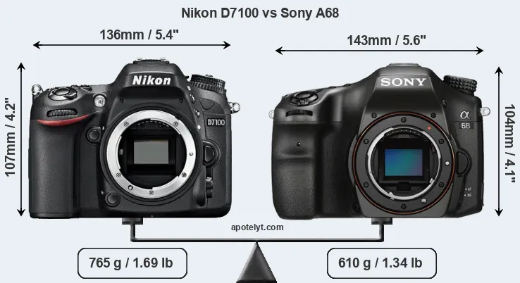 If the front view area (width x height) of the cameras is taken as an aggregate measure of their size, the Sony A68 is somewhat larger (2 percent) than the Nikon D7100. However, the A68 is markedly lighter (20 percent) than the D7100. It is worth mentioning in this context that the D7100 is splash and dust resistant, while the A68 does not feature any corresponding weather-sealing.