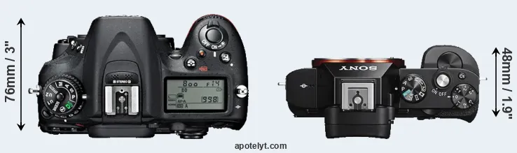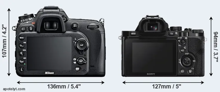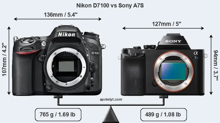 The physical size and weight of the Nikon D7100 and the Sony A7S are illustrated in the side-by-side display below. The two cameras are presented according to their relative size. Three consecutive perspectives from the front, the top, and the back are available. All width, height and depth measures are rounded to the nearest millimeter.