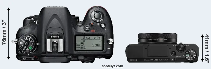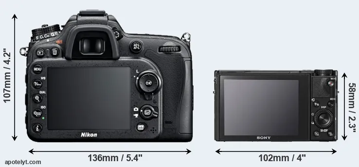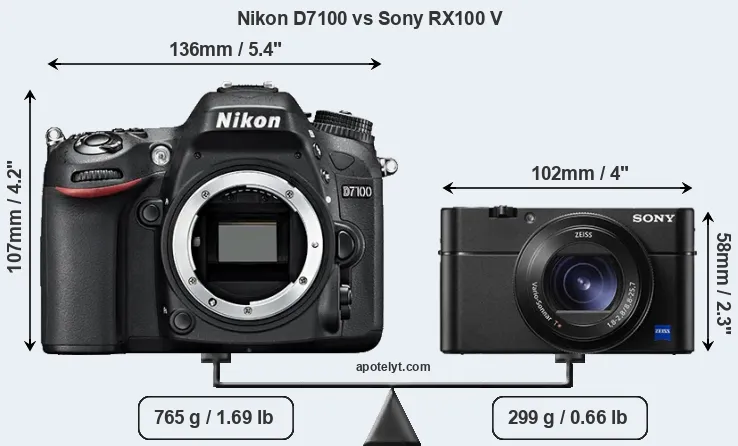 The physical size and weight of the Nikon D7100 and the Sony RX100 V are illustrated in the side-by-side display below. The two cameras are presented according to their relative size. Three consecutive perspectives from the front, the top, and the back are available. All size dimensions are rounded to the nearest millimeter.
