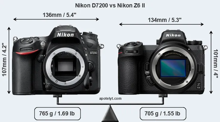 An illustration of the physical size and weight of the Nikon D7200 and the Nikon Z6 II is provided in the side-by-side display below. The two cameras are presented according to their relative size. Three consecutive views from the front, the top, and the rear side are shown. All width, height and depth dimensions are rounded to the nearest millimeter.
