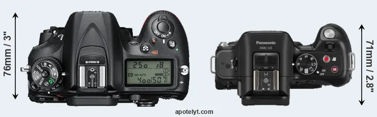 An illustration of the physical size and weight of the Nikon D7200 and the Panasonic G5 is provided in the side-by-side display below. The two cameras are presented according to their relative size. Three successive views from the front, the top, and the rear are shown. All width, height and depth dimensions are rounded to the nearest millimeter.