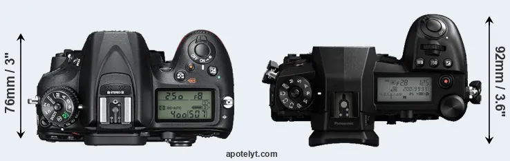The physical size and weight of the Nikon D7200 and the Panasonic G9 are illustrated in the side-by-side display below. The two cameras are presented according to their relative size. Three consecutive views from the front, the top, and the rear side are shown. All width, height and depth measures are rounded to the nearest millimeter.