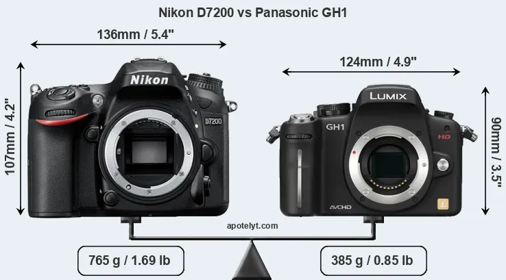 An illustration of the physical size and weight of the Nikon D7200 and the Panasonic GH1 is provided in the side-by-side display below. The two cameras are presented according to their relative size. Three consecutive perspectives from the front, the top, and the back are available. All size dimensions are rounded to the nearest millimeter.