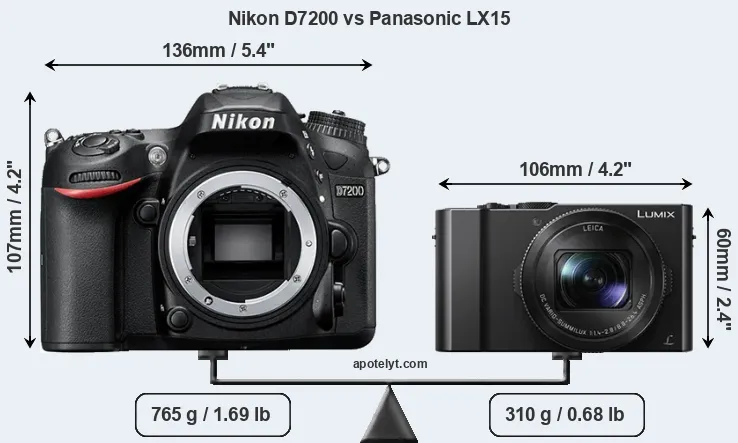 An illustration of the physical size and weight of the Nikon D7200 and the Panasonic LX15 is provided in the side-by-side display below. The two cameras are presented according to their relative size. Three consecutive perspectives from the front, the top, and the back are available. All size dimensions are rounded to the nearest millimeter.