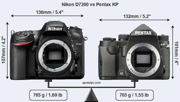 An illustration of the physical size and weight of the Nikon D7200 and the Pentax KP is provided in the side-by-side display below. The two cameras are presented according to their relative size. Three consecutive perspectives from the front, the top, and the back are available. All width, height and depth dimensions are rounded to the nearest millimeter.
