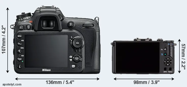 The side-by-side display below illustrates the physical size and weight of the Nikon D7200 and the Pentax Q. The two cameras are presented according to their relative size. Three consecutive views from the front, the top, and the rear side are shown. All width, height and depth measures are rounded to the nearest millimeter.