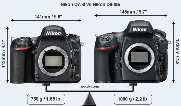An illustration of the physical size and weight of the Nikon D750 and the Nikon D800E is provided in the side-by-side display below. The two cameras are presented according to their relative size. Three consecutive perspectives from the front, the top, and the back are available. All width, height and depth measures are rounded to the nearest millimeter.