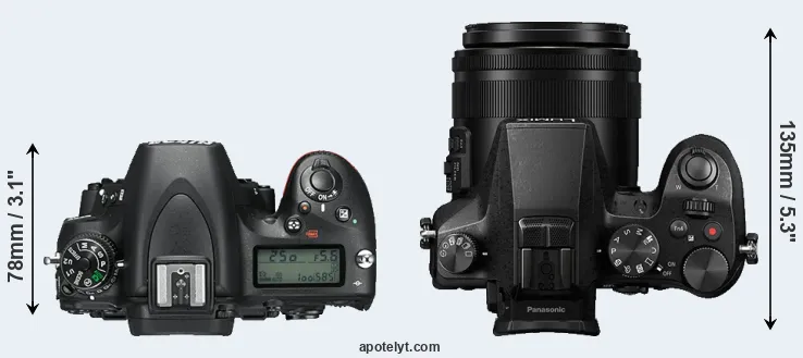 The physical size and weight of the Nikon D750 and the Panasonic FZ2000 are illustrated in the side-by-side display below. The two cameras are presented according to their relative size. Three successive views from the front, the top, and the rear are shown. All width, height and depth dimensions are rounded to the nearest millimeter.