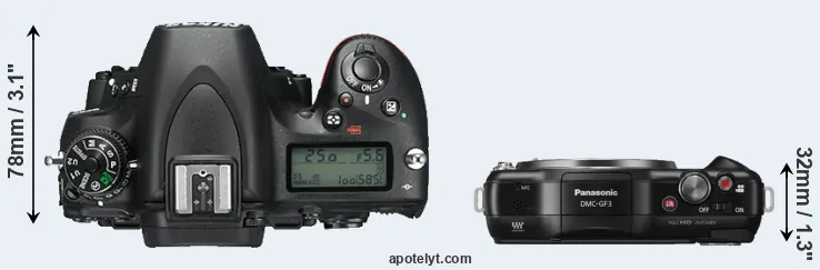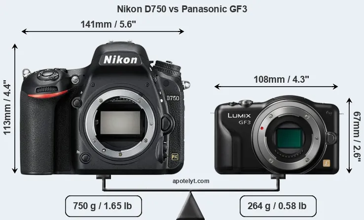 The side-by-side display below illustrates the physical size and weight of the Nikon D750 and the Panasonic GF3. The two cameras are presented according to their relative size. Three successive views from the front, the top, and the rear are shown. All width, height and depth dimensions are rounded to the nearest millimeter.