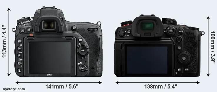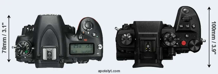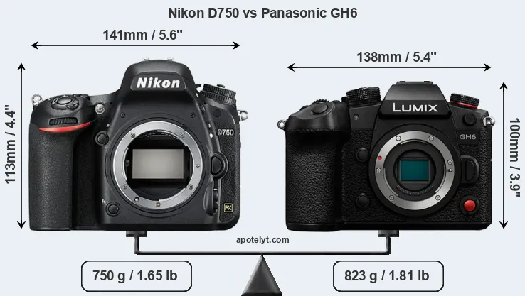 The physical size and weight of the Nikon D750 and the Panasonic GH6 are illustrated in the side-by-side display below. The two cameras are presented according to their relative size. Three consecutive perspectives from the front, the top, and the back are available. All width, height and depth measures are rounded to the nearest millimeter.