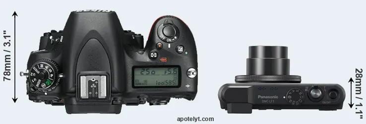 The side-by-side display below illustrates the physical size and weight of the Nikon D750 and the Panasonic LF1. The two cameras are presented according to their relative size. Three consecutive views from the front, the top, and the rear side are shown. All width, height and depth dimensions are rounded to the nearest millimeter.