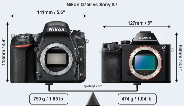 An illustration of the physical size and weight of the Nikon D750 and the Sony A7 is provided in the side-by-side display below. The two cameras are presented according to their relative size. Three consecutive perspectives from the front, the top, and the back are available. All size dimensions are rounded to the nearest millimeter.