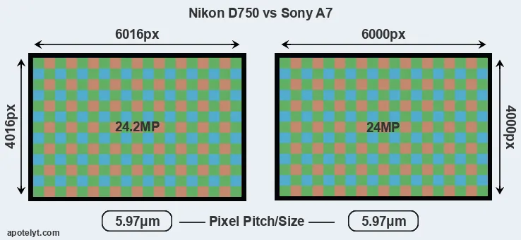 With 24.2MP, the D750 offers a slightly higher resolution than the A7 (24MP), but the D750 nevertheless has the same individual pixel size (pixel pitch of 5.97μm) as the A7 due to its larger sensor. It is noteworthy in this context that the D750 is a somewhat more recent model (by 10 months) than the A7, and its sensor might have benefitted from technological advances during this time that further enhance the light gathering capacity of its pixels.