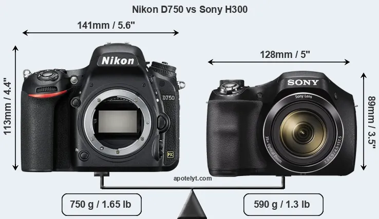 An illustration of the physical size and weight of the Nikon D750 and the Sony H300 is provided in the side-by-side display below. The two cameras are presented according to their relative size. Three consecutive views from the front, the top, and the rear side are shown. All width, height and depth dimensions are rounded to the nearest millimeter.