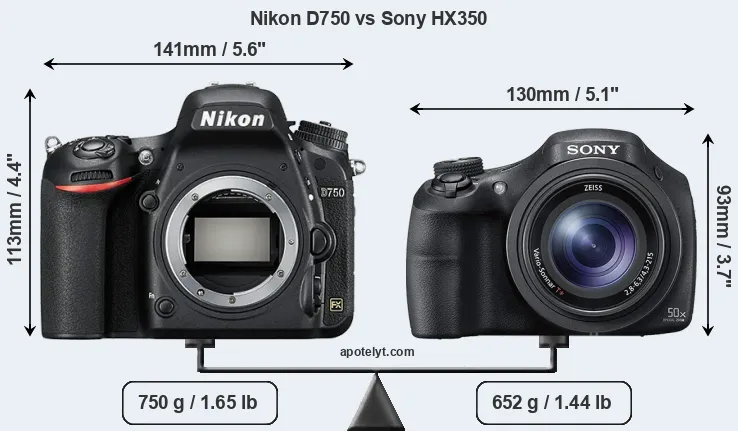 The side-by-side display below illustrates the physical size and weight of the Nikon D750 and the Sony HX350. The two cameras are presented according to their relative size. Three consecutive perspectives from the front, the top, and the back are available. All size dimensions are rounded to the nearest millimeter.