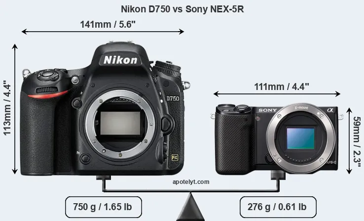 The side-by-side display below illustrates the physical size and weight of the Nikon D750 and the Sony NEX-5R. The two cameras are presented according to their relative size. Three consecutive views from the front, the top, and the rear side are shown. All width, height and depth dimensions are rounded to the nearest millimeter.