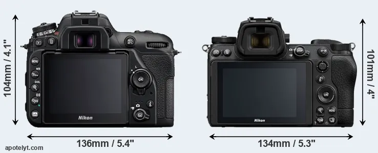 An illustration of the physical size and weight of the Nikon D7500 and the Nikon Z7 II is provided in the side-by-side display below. The two cameras are presented according to their relative size. Three successive views from the front, the top, and the rear are shown. All width, height and depth dimensions are rounded to the nearest millimeter.