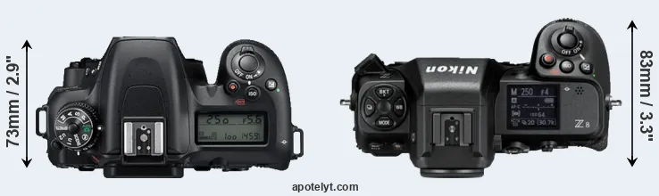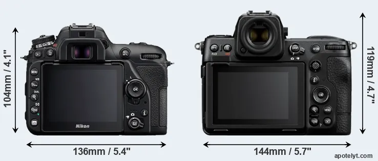The physical size and weight of the Nikon D7500 and the Nikon Z8 are illustrated in the side-by-side display below. The two cameras are presented according to their relative size. Three successive views from the front, the top, and the rear are shown. All size dimensions are rounded to the nearest millimeter.