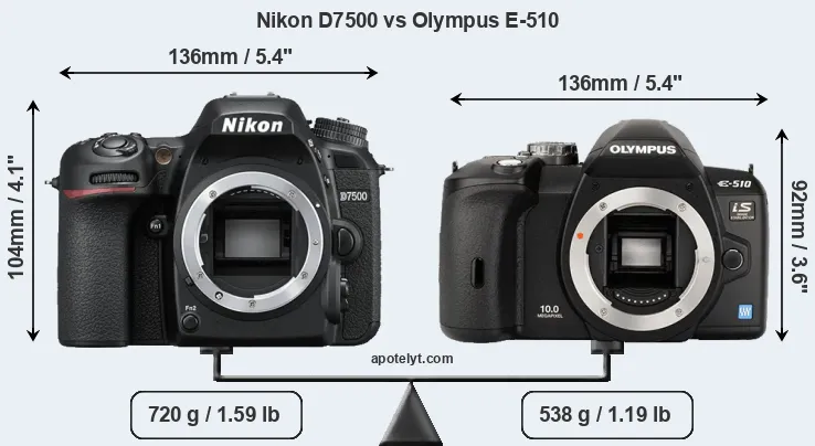 The physical size and weight of the Nikon D7500 and the Olympus E-510 are illustrated in the side-by-side display below. The two cameras are presented according to their relative size. Three consecutive perspectives from the front, the top, and the back are available. All width, height and depth dimensions are rounded to the nearest millimeter.