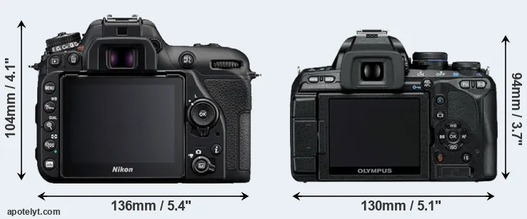 The physical size and weight of the Nikon D7500 and the Olympus E-600 are illustrated in the side-by-side display below. The two cameras are presented according to their relative size. Three consecutive views from the front, the top, and the rear side are shown. All size dimensions are rounded to the nearest millimeter.