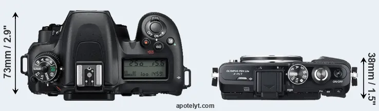 An illustration of the physical size and weight of the Nikon D7500 and the Olympus E-PL7 is provided in the side-by-side display below. The two cameras are presented according to their relative size. Three consecutive perspectives from the front, the top, and the back are available. All width, height and depth dimensions are rounded to the nearest millimeter.
