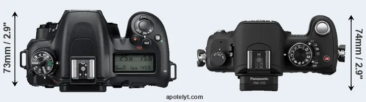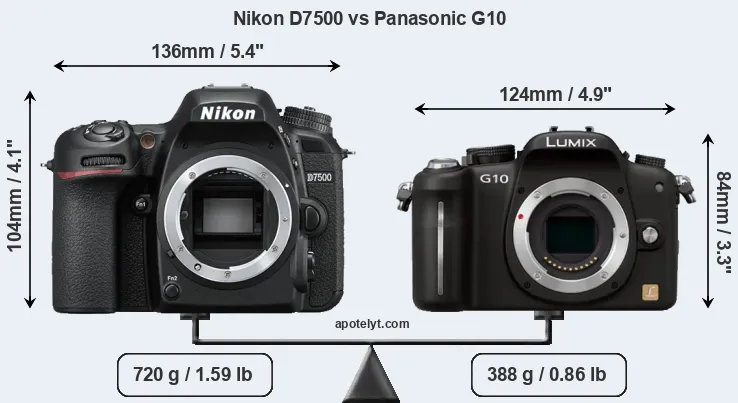 The physical size and weight of the Nikon D7500 and the Panasonic G10 are illustrated in the side-by-side display below. The two cameras are presented according to their relative size. Three consecutive views from the front, the top, and the rear side are shown. All width, height and depth measures are rounded to the nearest millimeter.
