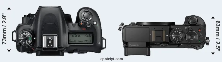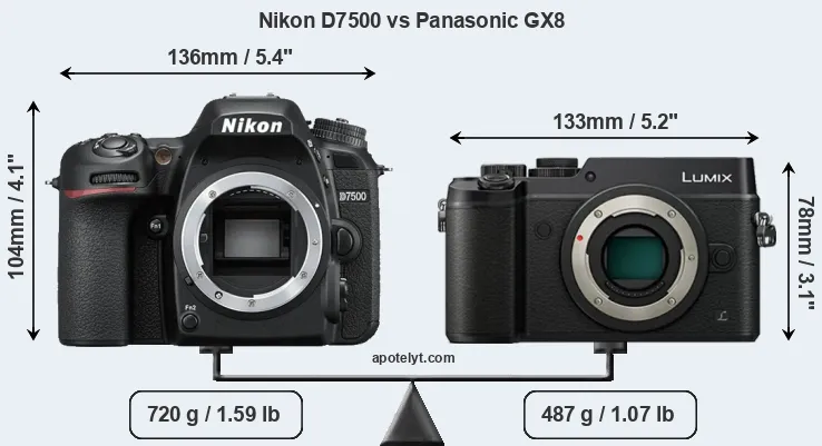 An illustration of the physical size and weight of the Nikon D7500 and the Panasonic GX8 is provided in the side-by-side display below. The two cameras are presented according to their relative size. Three consecutive perspectives from the front, the top, and the back are available. All size dimensions are rounded to the nearest millimeter.