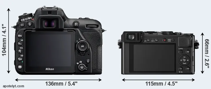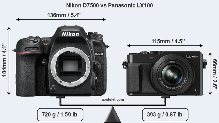The physical size and weight of the Nikon D7500 and the Panasonic LX100 are illustrated in the side-by-side display below. The two cameras are presented according to their relative size. Three consecutive perspectives from the front, the top, and the back are available. All width, height and depth measures are rounded to the nearest millimeter.